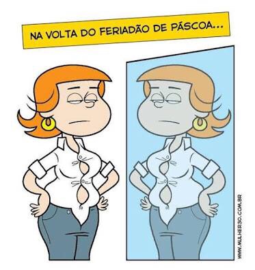 Já minha mãe está na cozinha, pilhada, pistola, deixando meu pai maluco, porque precisa fazer o almoço todinho e em crise existencial. Toda Páscoa ela fica meio de mau humor. Vai entender… Um dia, caí na besteira de perguntar a razão e quase perdi a língua, mas meu pai me chamou no canto e explicou que mulher é um ser interessante, quer estar linda e maravilhosa, caber em roupas de 10 anos atrás (para quê?!), só que não resiste às comidas boas, está sempre querendo um chocolatinho e depois fica chateada porque engordou. Toda Páscoa minha mãe diz que vai passar à base de alface, mas acaba cedendo ao bolo, ao pavê, aos ovos e termina o domingo amaldiçoando até o Fantástico.
